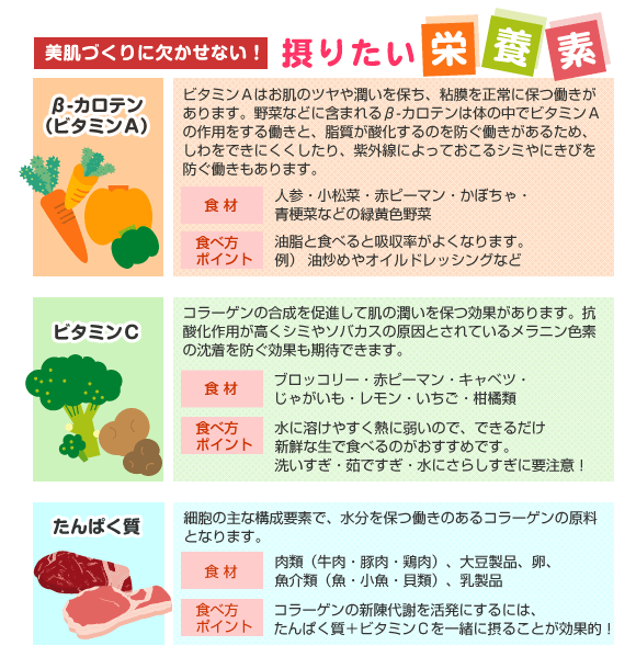 美肌効果のある成長ホルモンですが、最近注目されているのは、血液中の糖分や脂質の値が高いと成長ホルモンがうまく作られないということです。著しい肥満や夜遅い時間帯に食べることが睡眠以上に成長ホルモンの分泌に影響するといわれています。ということは、おやつを食べながらの夜更かしは、まさにお肌の対敵なのです!日頃から食事と生活のリズムを整えてお肌も体も健康に過ごしましょう!