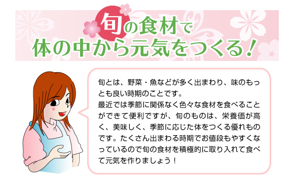 最近は1年中出まわっている食材が多く、旬をとらえるのがむずかしく感じますが、実際はその時期にたくさん収穫されるので、買い物に行った時に、安くてたくさん販売されていて鮮度の良いものが概ね旬の食材ということです。春は、菜の花やふき、春キャベツや新じゃが、 あさりなどの貝類や新わかめなどお店で目にする機会が増えるのではないでしょうか。旬の食材を取り入れるには意識してお店を観察してみてください。時季にあった食材は、私たちの体を中から整えてくれます。旬の食材を美味しく食べて健康を維持していきましょう!