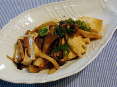 しいたけは石づきを取り、かさ、軸を細切りに、えのきは根元を落として長さを半分にします。しめじは根元を落として小房に分け、まいたけは食べやすい大きさに切ります。