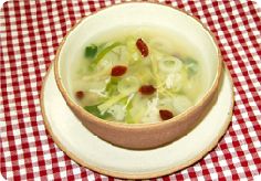 なべに水、中華スープの素を入れ、火にかけます。沸騰すれば白ねぎ、しょうがを加えて煮ます。野菜に火が通 れば貝柱の缶詰を汁ごと加え、少し煮ます。最後に塩を加えて味をととのえます。