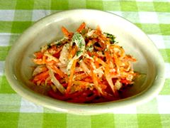 ボウルにマヨネーズ、酢を合わせ、サケ缶 、水気を絞ったにんじん、玉ねぎ、みじん切りのパセリを混ぜ合わせます。
