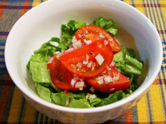 玉ねぎはみじん切りに、トマトはくし型に、リーフレタスはざく切りします。