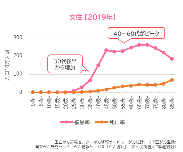 乳がんは30代後半から増加し始め、40~60代でピークとなり、その後もほとんど減少しません。