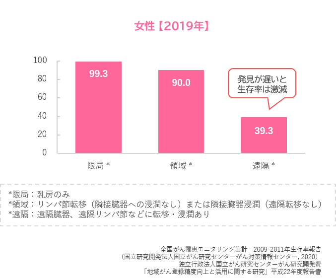 乳がんで亡くなる方も増加傾向ですが、早期に発見・治療することで、5年生存率は90%以上となっています。
