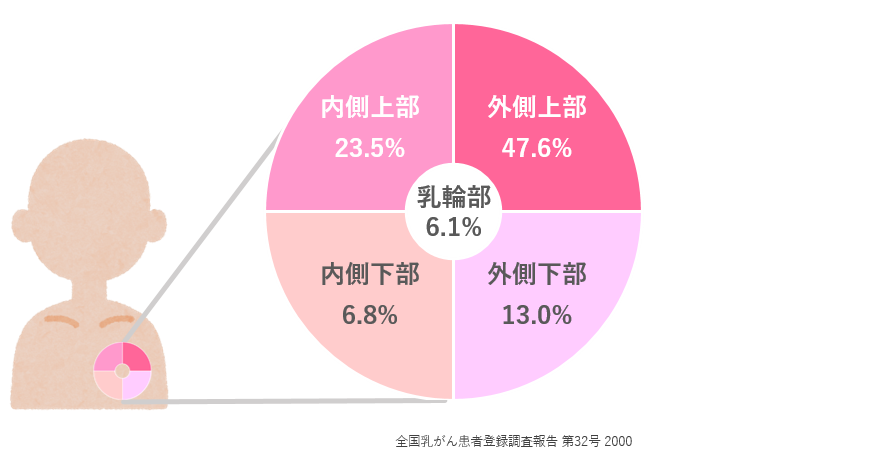 乳がんが発生しやすい場所としては、乳首を中心に乳房を4つに分けると、乳房の外側の上、内側の上、外側の下、内側の下、乳輪付近の順です。