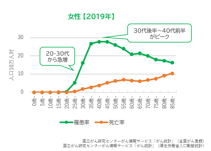 最も多いのは40代ですが、他のがんに比べて20~30代での罹患者の増加が問題となっています。
