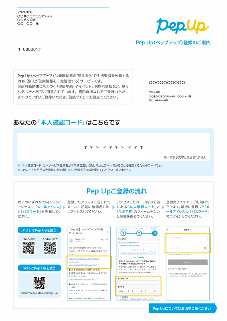 ・Pep Upの登録には同封されている『本人確認コード』が必要です。 新たに当組合に加入された方は、封筒がお手元に届くまでに1~2か月程度要します。