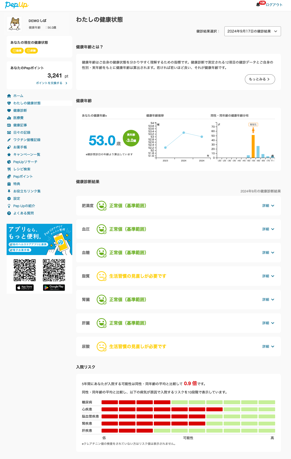 健康診断の結果だけでなく、各検査値についての判定や同世代平均なども表示され、自分の健康状態を確認することができます。健診値のレベルに合わせて生活習慣に対するアドバイスも表示されます。