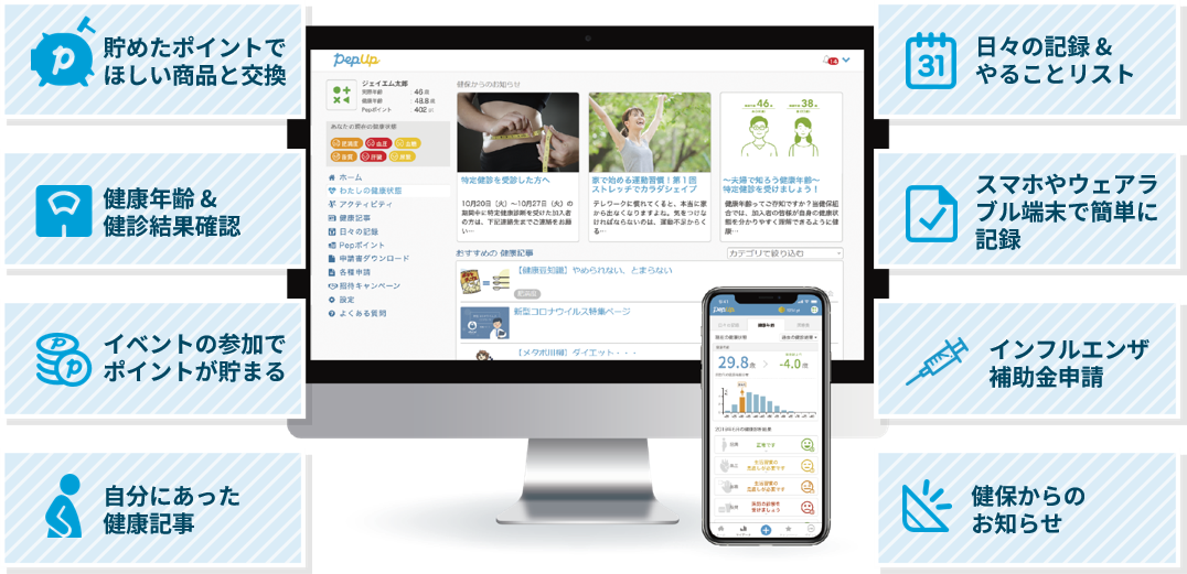 健康イベントや健康記事の閲覧など、達成内容に応じてPepポイントを取得することができ、ためたポイントで商品交換ができます。