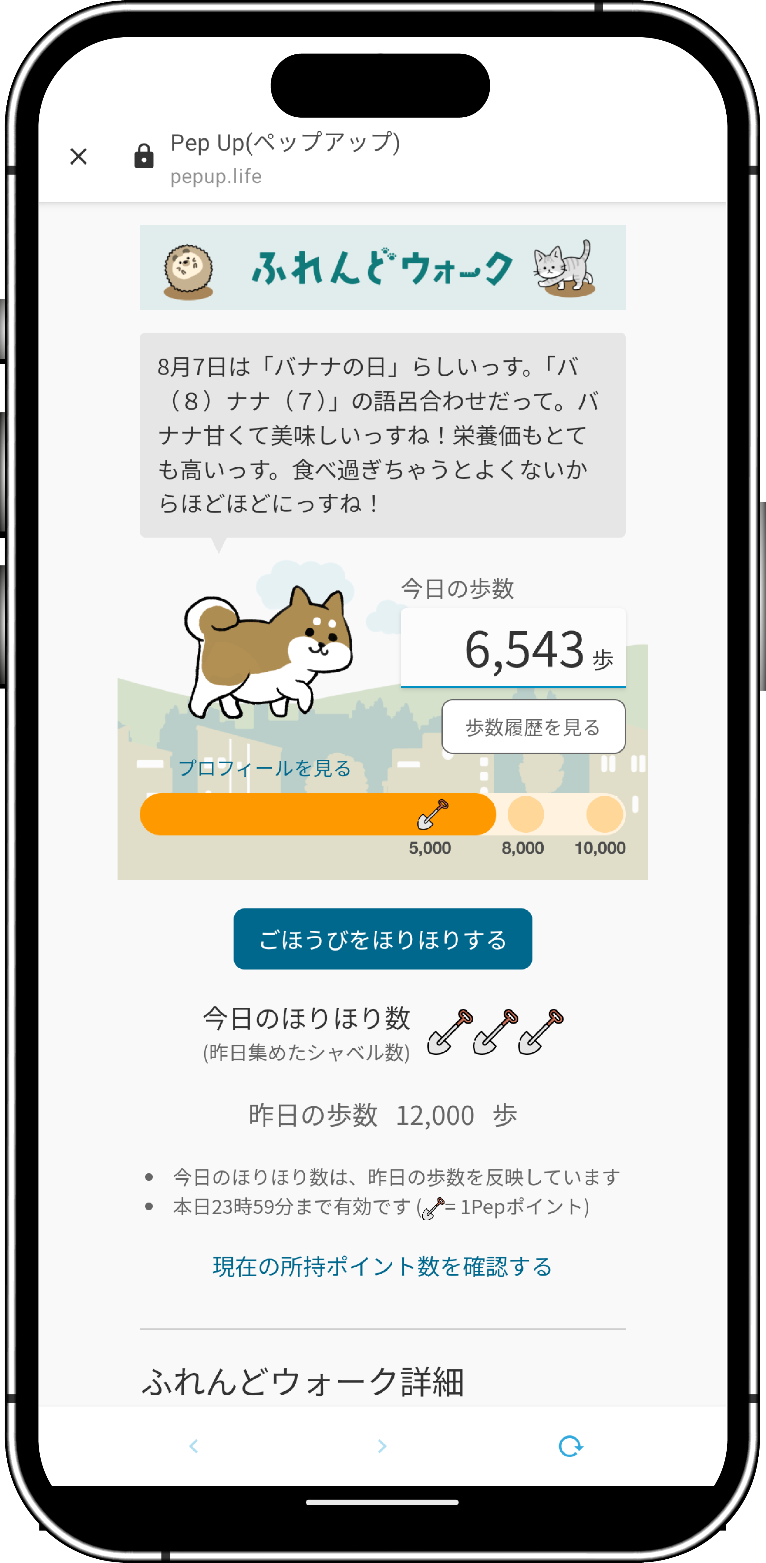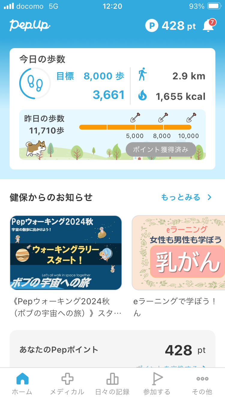 キャラクターと一緒に毎日楽しく続けられます。歩数に応じてごほうび(Pepポイント)を獲得できます。