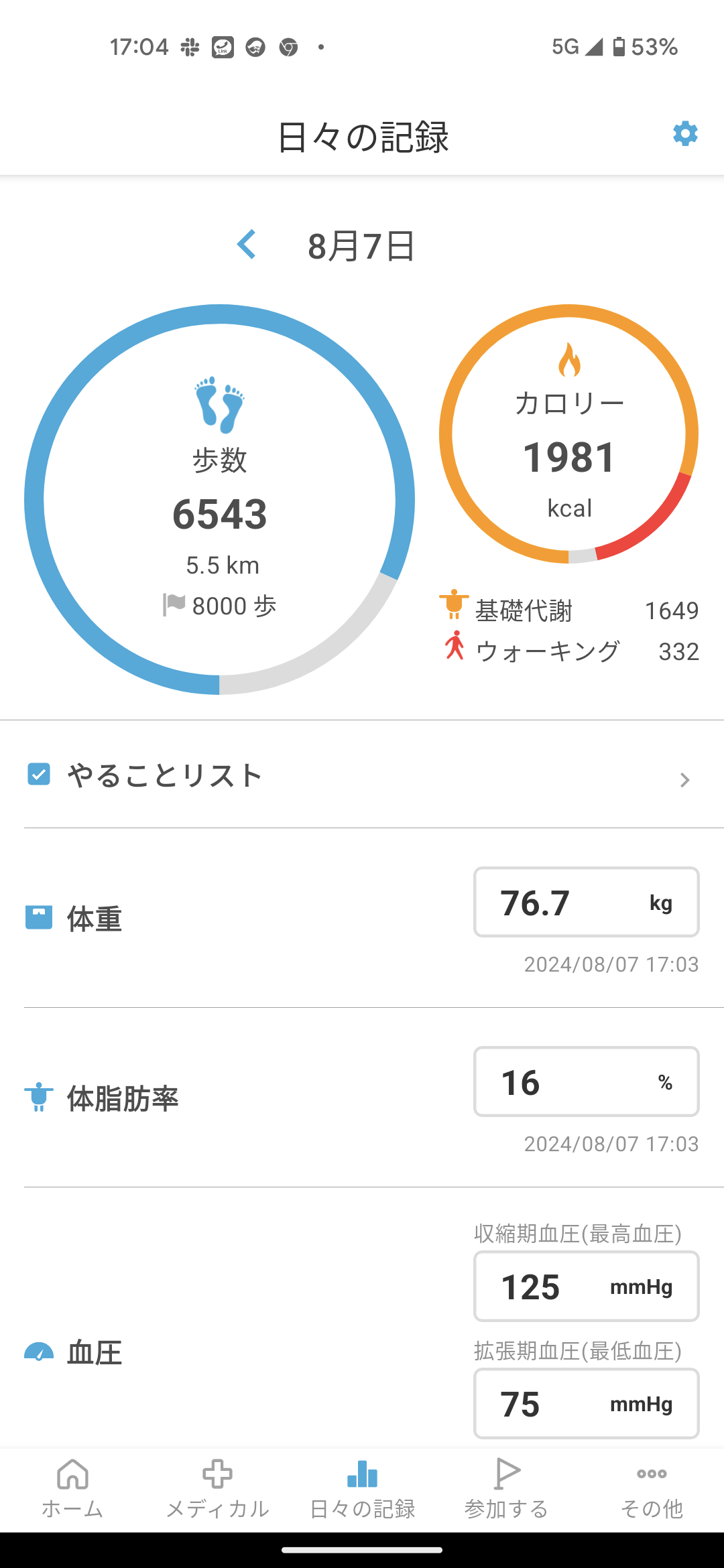 歩数、体重、睡眠時間、⾎圧など、健康管理に⽋かせないバイタルの値を「日々の記録」として毎日手軽に記録することができます。